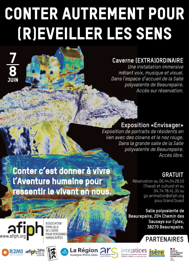 Sortie de (première) résidence pour ce tout nouveau conte (pas du tout pour les enfants). Ça se passé au foyer AFIPH Grand ouest de Beaurepaire. Il y a eu des contes en services, ou chacun est allé présenter son univers artistique dans les unités de vie. Il y a eu des balades contées, avec les trois compagnies qui se rencontrent et proposent des contes en improvisation. il ya enfin le rendu final, le 7 et 8 juin à la salle des fêtes de Beaurepaire. Une balade immersive dans les travaux de création de la compagnie SUPERLEVURE, de la conteuse Géraldine MAURIN et du chanteur/conteur Samuel LACHISE.